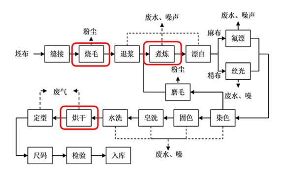 紡織印染的主要流程分為3步:前處理、染色印花、后收拾,其主要工序有燒毛、退漿、煮煉、漂白、絲光、定型、烘干和染色等。鍋爐是紡織生產線設備中的一員,用來帶動烘干等設備,并在壓片、燒毛、退煮漂、定型、染色等環節中供熱。
